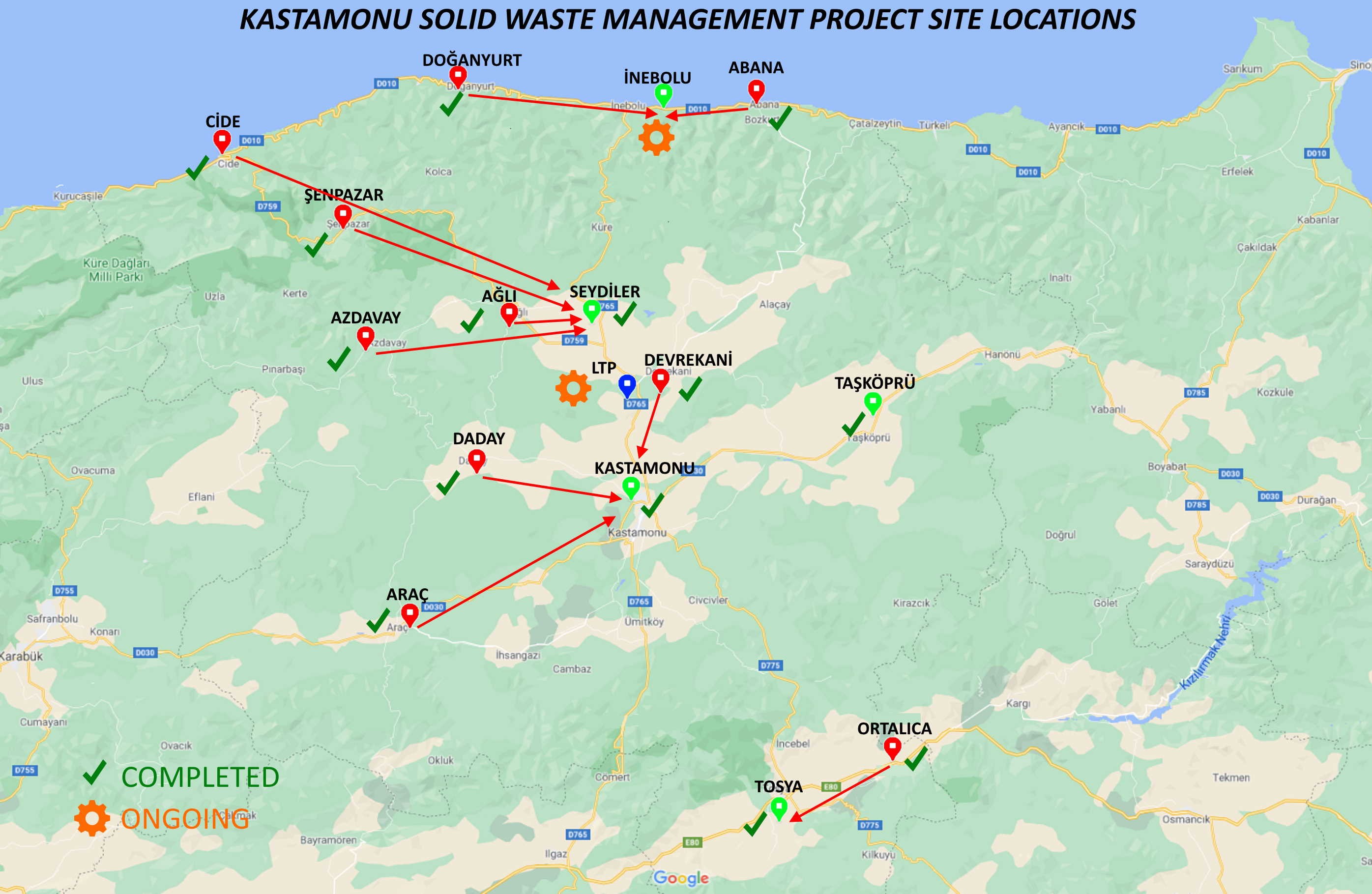 Rehabilitation of 5 sites in Kastamonu, Taşköprü, Tosya, Inebolu and Seydü, and the transportation of garbage from 10 different fields to these 5 sites and the construction of a 120 m3 / day treatment plant.